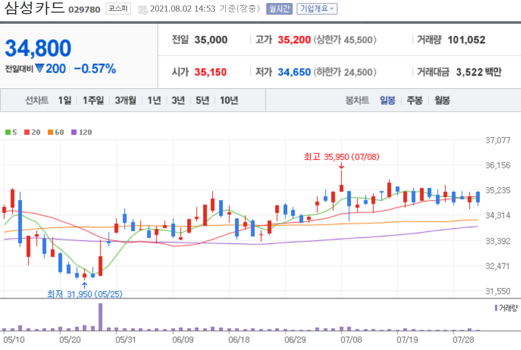 삼성카드의 주가는 몇달째 횡보를 하고 있습니다. 아주 사기 위치에 왔다고 보여집니다. 일봉상 2달정도 박스권 횡보를 하고 있고 위로든 아래로든 방향을 잡을 타이밍인것 같습니다.