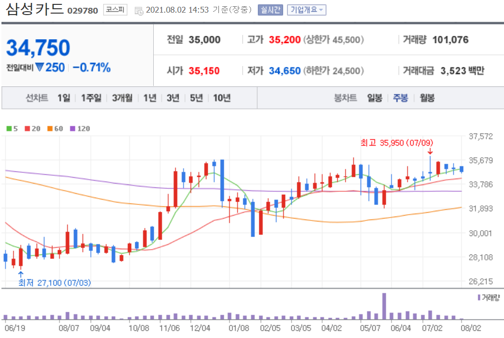 삼성카드는 현재 올해 예상 매출은 3조 5천억, 영업이익은 6500억 수준으로 현재 시총 4조 대비 저평가 구간이라고 보여 집니다. 삼성카드는 5차 재난지원금 수혜와 더불어 실적도 계속 좋아지고 있기 때문에 관심있게 지켜봐야할 종목입니다.