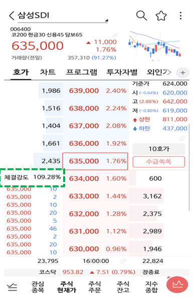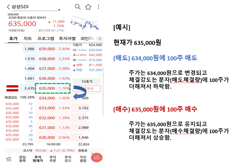 그러므로 체결강도는 하락하게 됩니다. 반대로 투자자B가 635,000원에 100주를 매수한다면 주가는 현재가 635,000원으로 유지가 되고 체결강도는 매수체결량(분자)에 100주가 더해지므로 분자 값이 더 커지게 됩니다. 따라서 체결강도는 상승하게 됩니다.