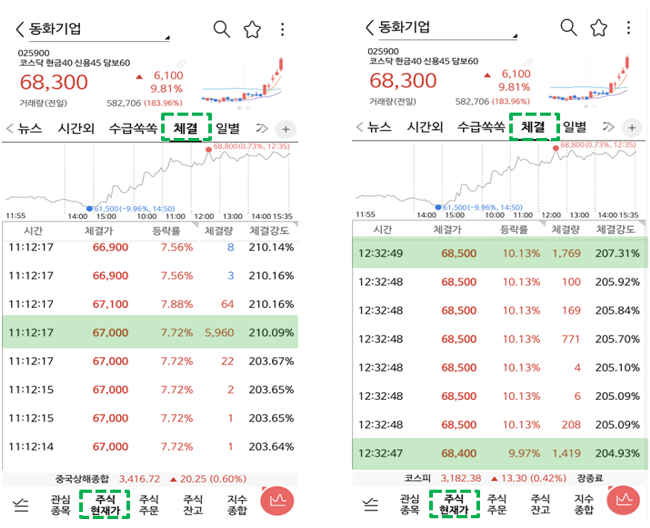 일반적으로 단기 트레이딩을 할 경우에는 체결강도의 상승과 하락의 흐름을 주의 깊게 관찰하여 매매를 하면 효과적일 것입니다.