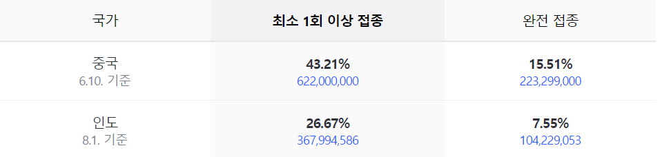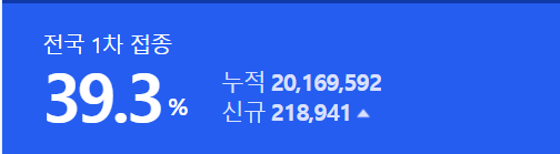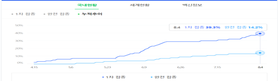 대한민국 정부는 9월 접종률 70% 이상의 목표를 달성하기 위해 백신 접종 속도를 높이고 있습니다. 현재 8/4일 기준으로 코로나 백신 접종률은 39%를 넘겼습니다. (1차 접종 기준)