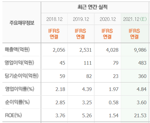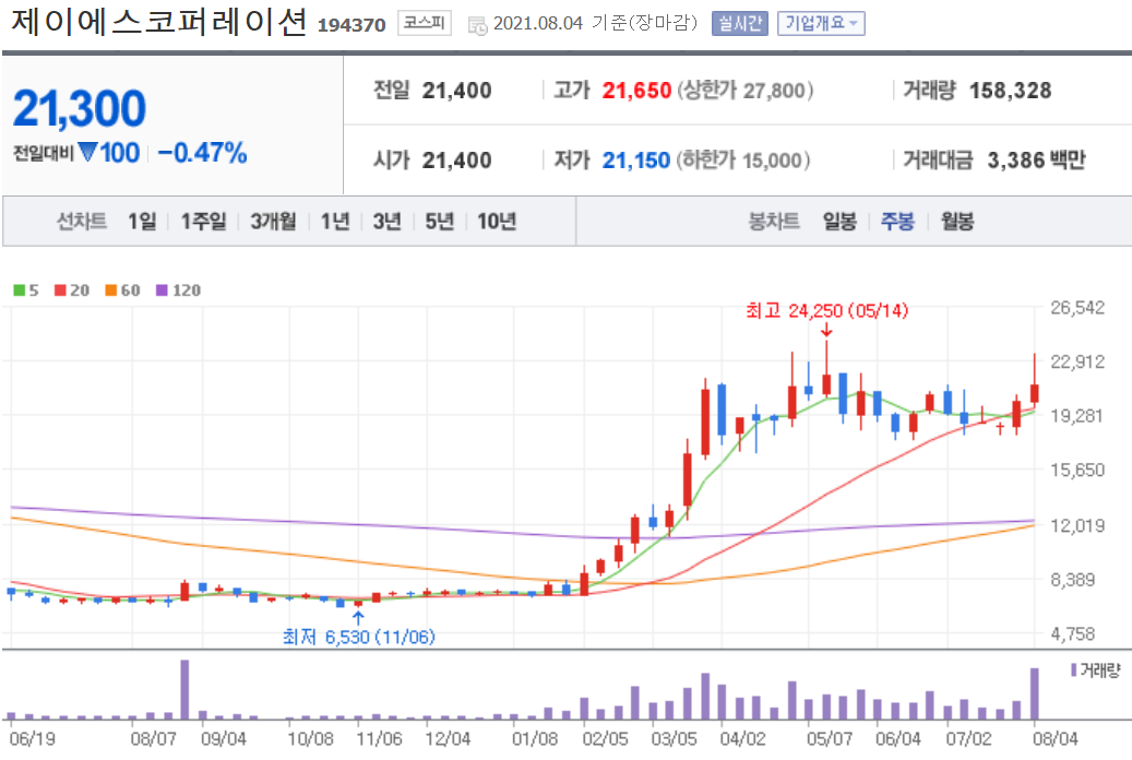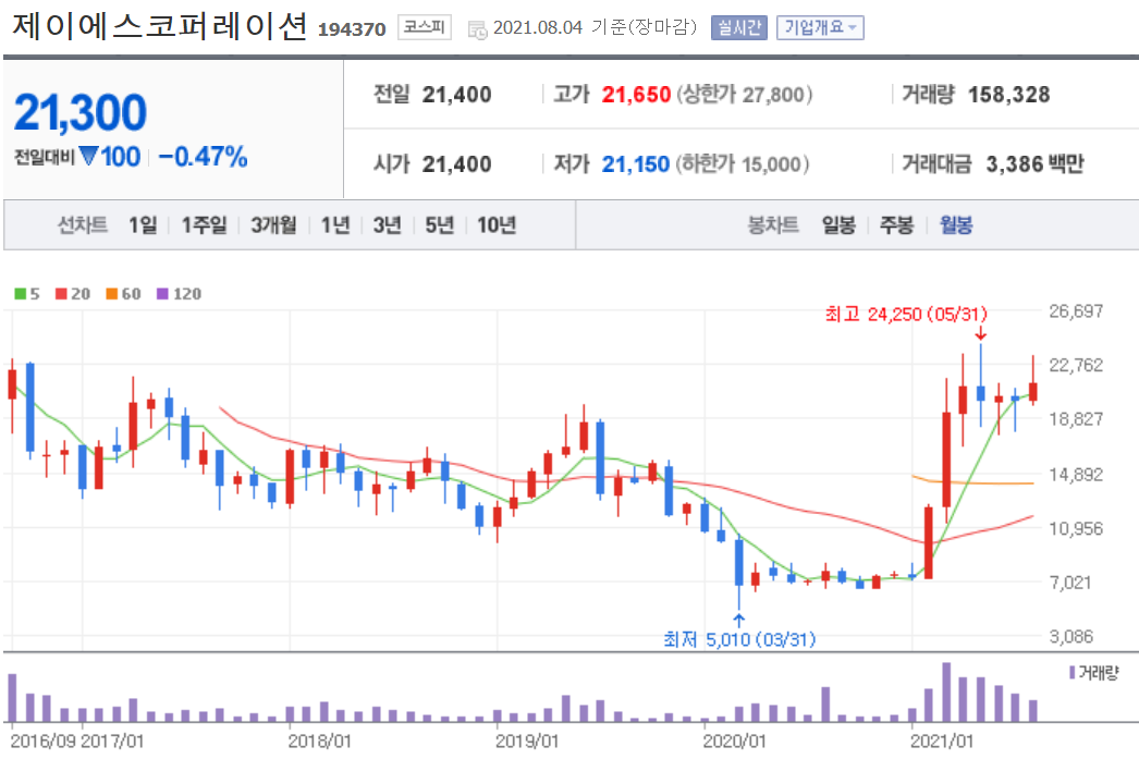 제이에서 코퍼레이션은 올해 예상 매출액 약 1조 원에 영업이익이 480억 수준입니다. 현재 시가총액 2800억을 본다면 올해 실적을 기준으로 상당히 저평가되어 있다고 볼 수 있습니다.