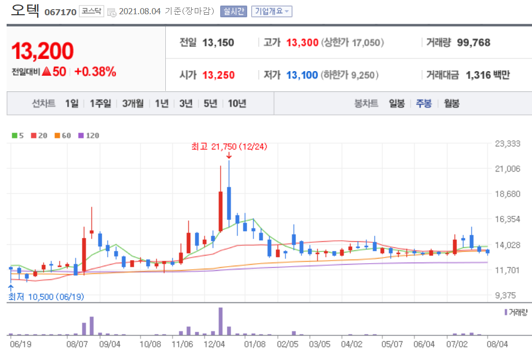 오텍의 차트를 주봉으로 보면 꽤 긴 조정구간에 위치하고 있습니다. 2분기 실적 발표와 3분기 실적 기대감이 높아진다면 충분히 전고점을 돌파할 수 있을 거라고 생각합니다. 오텍도 지금부터 분할 매수를 고려해 보시는 것도 좋을 것 같습니다.