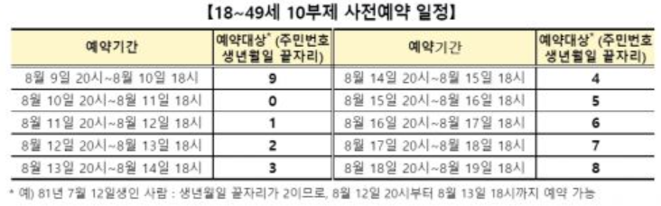 - 예약 기간 : [백신 10부제] 8/9(월) ~ 8/18(수), <추가 예약 기간> 8/19(목) ~ 9/17(금)