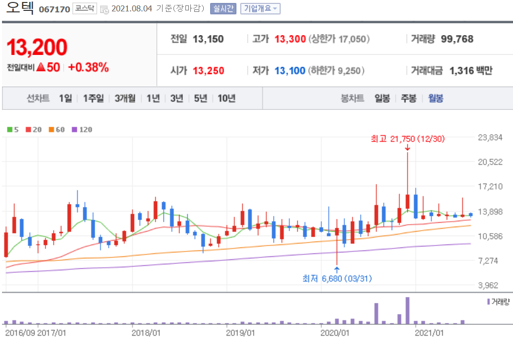 오텍은 올해 실적이 중요합니다. 작년 코로나로 영업이익이 1/3 가량으로 줄었기 때문에 올해 실적을 2019년 수준으로 회복한다면 주가가 급반등이 나올 수 있습니다. 오텍은 코로나 읍압병동과 백신 운송을 위한 콜드체인으로 투자자들에게 알려져 있습니다. 현재 시총 2000억은 좀 싸다고 생각이 듭니다.