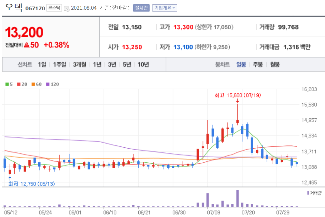 두 번째로는 콜드체인 관련주인 오텍입니다. 모더나와 화이자 모두 냉장 보관이 필요하므로 하반기 백신 보급량이 늘어나면 오텍이 가장 수혜를 받을 것으로 기대됩니다.