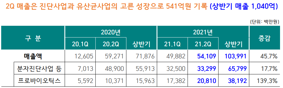 리포트 내용은 분자진단키트와 유산균(프로바이오틱스) 사업의 성장성이 매우 뛰어나다는 내용이었습니다.