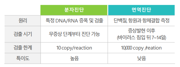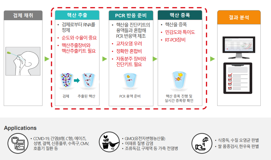 분자진단 기술은 특정 DNA/RNA를 증폭하여 검출하는 원리로 기존의 면역진단 방법과 차이가 있습니다. 분자진단 기술은 증상이 발현되기 전에도 어떤 바이러스에 감염되었는지를 확인할 수 있는 매우 진보적인 진단 기술입니다.