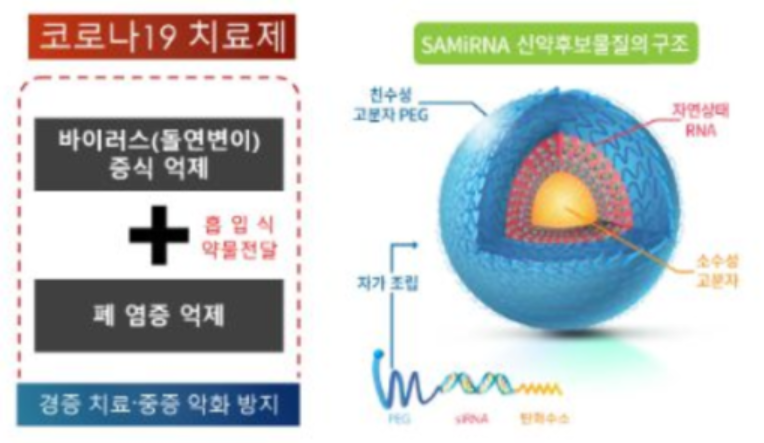 위의 코로나19 치료제 후보물질(SAMiRNA-SCV2)에 대한 임상시험 전단계인 독성시험을 시작했습니다. 이 치료제는 휴대용 초음파 네뷸라이저(연무식 흡입기)를 이용하는 호흡기 흡입 제형으로 개발할 예정입니다.