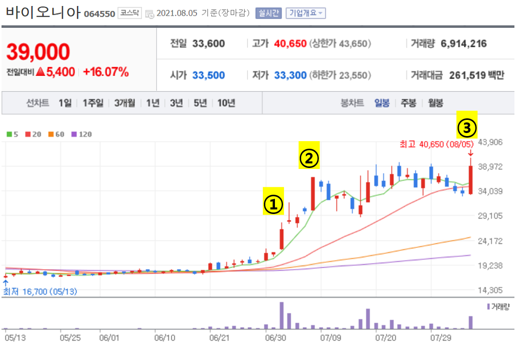 7월~8월 바이오니아의 주가가 급격이 상승한 요인을 차트를 보면서 설명드리겠습니다.