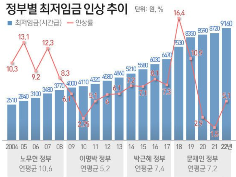 2004년부터 2022년까지 각 정부별 최저임금 인상률을 보면 이번 문재인 정부에서는 연평균 7.2%의 최저임금이 인상되었습니다. 이 수치는 노무현 정부나 박근혜 정부보다 작은 수치로 보이지만 금액으로 따진다면 5년간 2690원으로 가장 높은 인상액입니다.