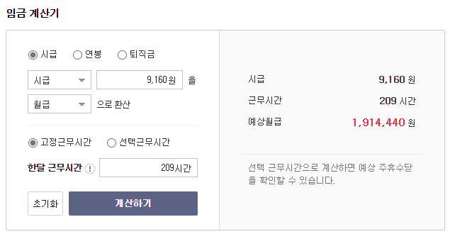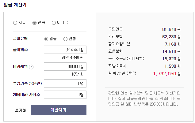위의 2022년 최저임금 9160원으로 계산된 월급은 실수령액이 아닌 세전 월급이기 때문에 세후 월급을 알고 싶으시면 임금 계산기> 연봉> 월급을 선택하시고 위의 계산된 월급 191만 4440원을 입력하시면 됩니다.
