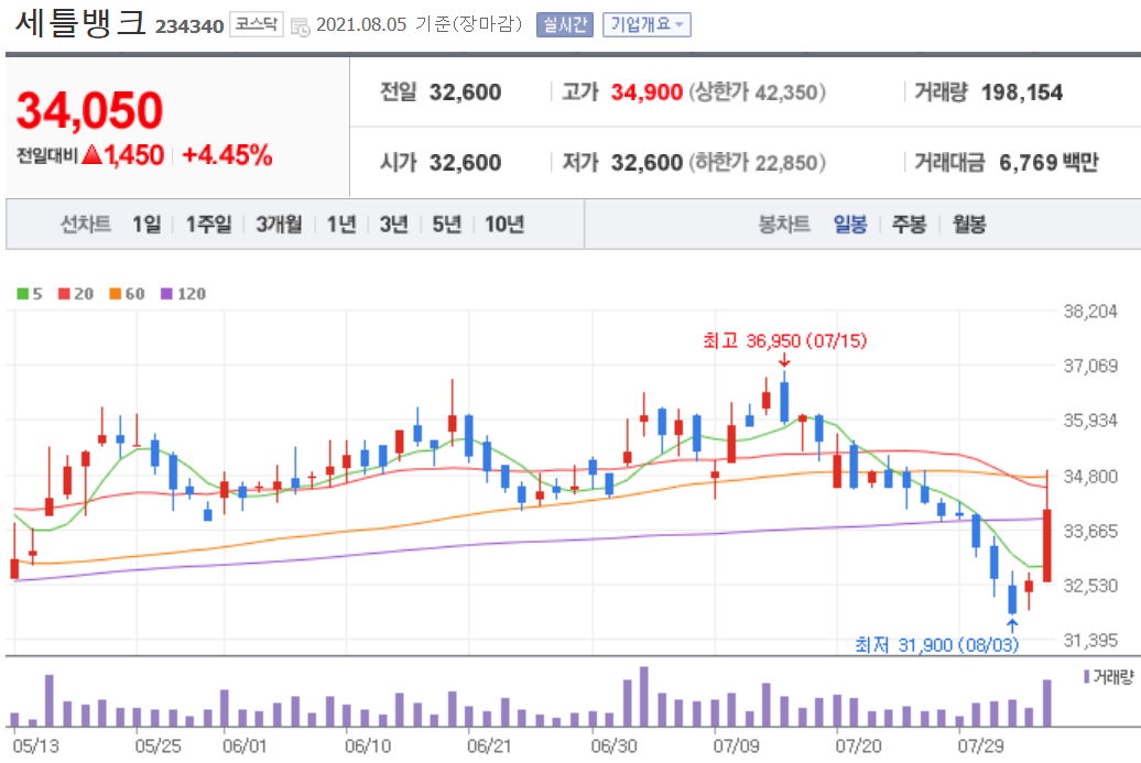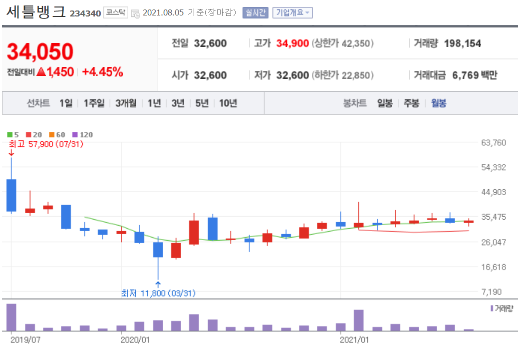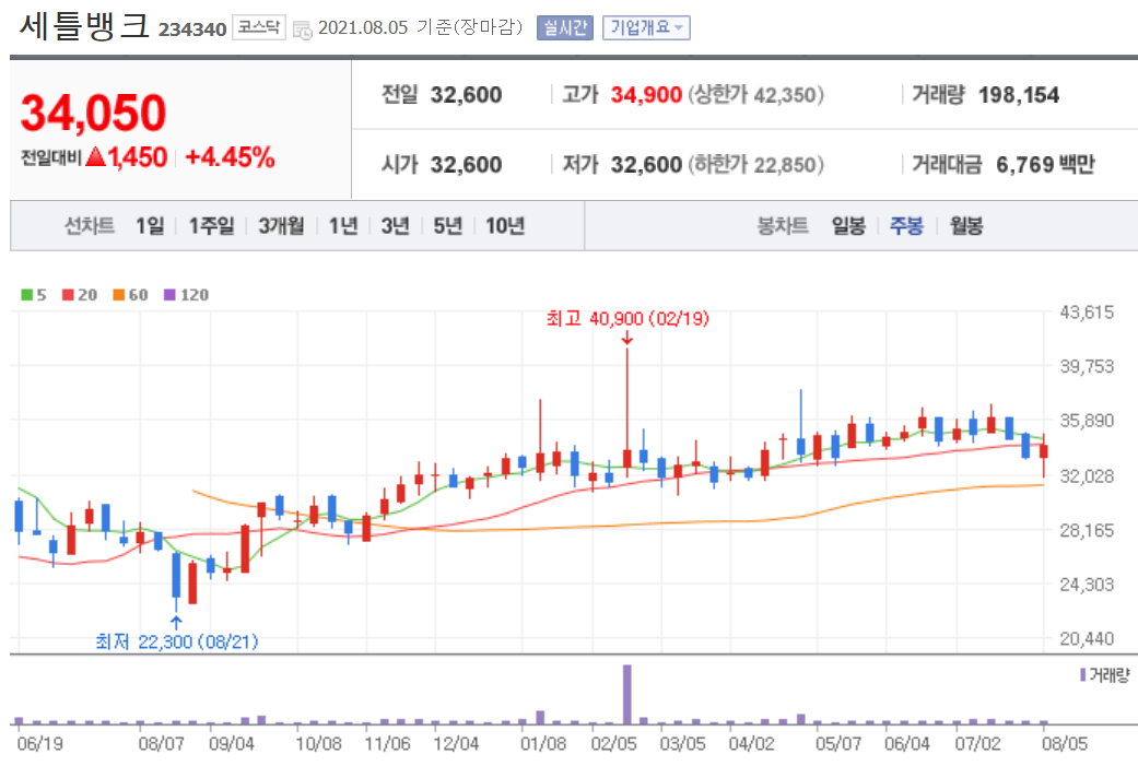 새틀뱅크도 주봉상으로 꾸준히 우상향을 하고 있습니다. 일봉상으로는 박스권을 이탈했다가 금일 V자 반등이 나왔네요.