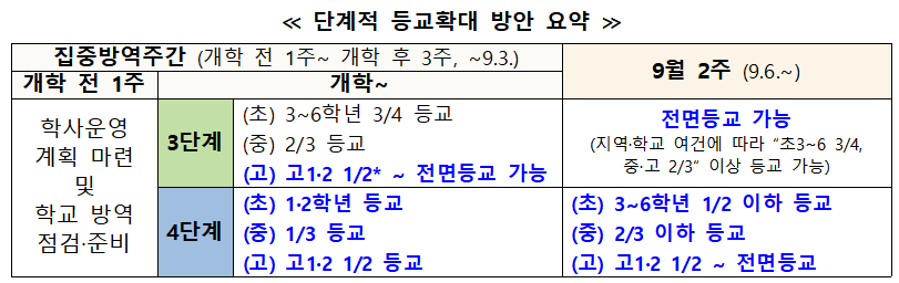 - 고등학교 1~2학년 : 1/2 ~ 전면 등교 가능