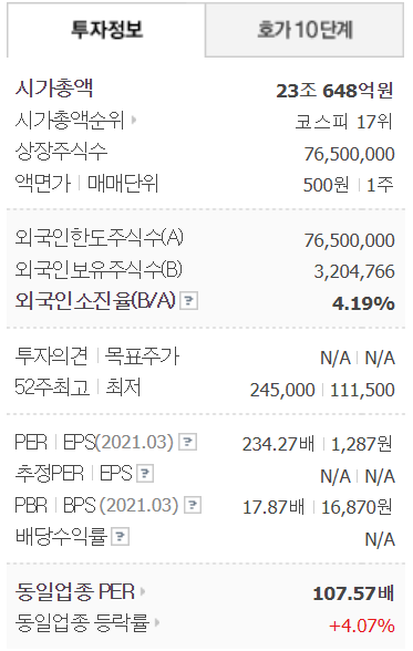 SK바이오사이언스는 현재 시총이 23조 원입니다. 그리고 올해 예상 매출은 약 1조 원에 영업이익은 4300억 원 수준입니다. 솔직히 싸다고는 말할 수 없습니다. 그러나 지금은 코로나 테마로 묶이면 상한가 가는 상황입니다.