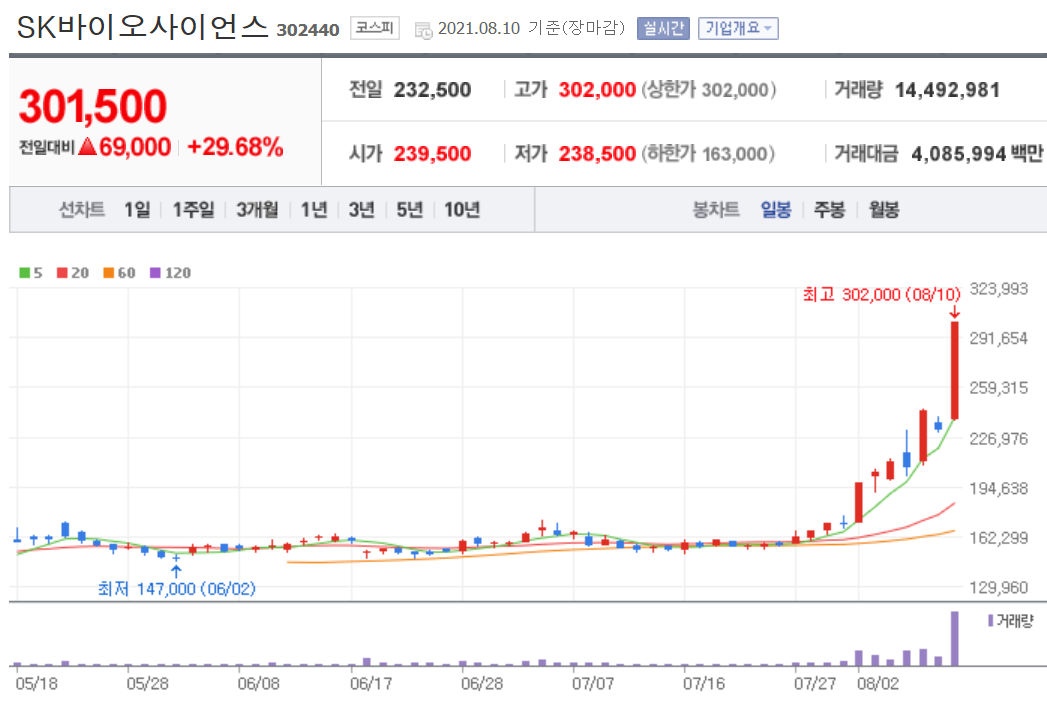SK바이오사이언스는 8월이 시작되자마자 거의 200% 가까이 주가가 폭등했습니다. 아래 차트를 보면 5월~7월까지 주가는 박스권형태를 유지하고 있었습니다. 그러다가 7월 말부터 주가가 상승하기 시작하면서 8/10일 상한가를 기록하게 됩니다.