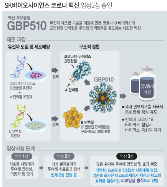 임상 3상 승인이라는 것은 판매가 가능한 승인은 아닙니다. 식약처에서 임상 3상 실험을 실행할 수 있는 허가를 준 것입니다. 이번 임상 3 상의 대조군으로는 아스트라제네카(AZ)와 함께 비교 실험하게 됩니다.