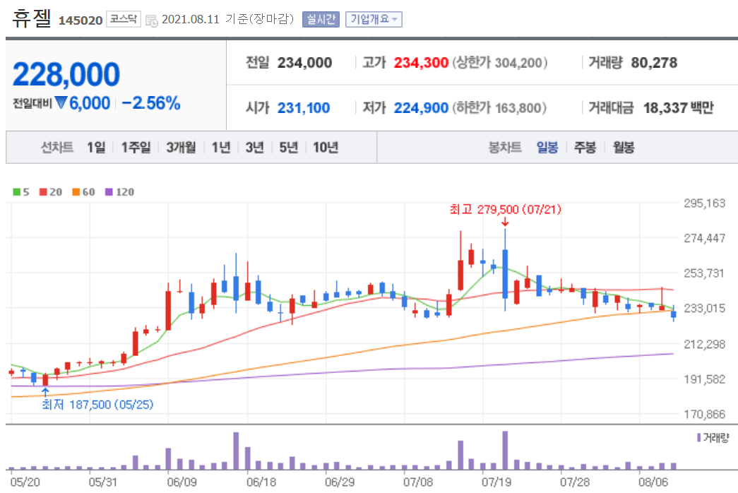 주봉과 월봉으로 봤을 때 휴젤의 차트는 아직 우상향 추세로 보여집니다. 현재는 약간의 조정구간으로 보이고 내일 주가가 급등한다면 추세를 계속 이어나갈 수 있을 것으로 보입니다.