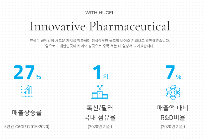 휴젤은 메디톡스, 대웅제약과 함께 이미 국내 보톡스 시장 빅3를 형성하고 있습니다. 국내 보톡스 시장은 이미 포화 상태이기 때문에 많은 기업들이 해외로 진출을 타진하고 있습니다.