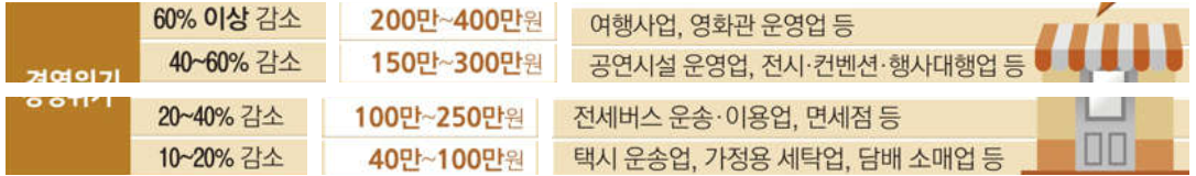 지난번 코로나 소상공인 4차 지원금(버팀목 자금 플러스)은 전년 대비 매출이 20% 이상 감소한 업종을 경영위기업종으로 선정했으나 이번 소상공인 5차 지원금(희망회복 자금)에서는 매출이 10~20% 감소한 업종까지도 경영위기 업종으로 구분하였습니다. (아래 괄호는 19년 대비 20년 업종별 매출 감소율입니다.)
