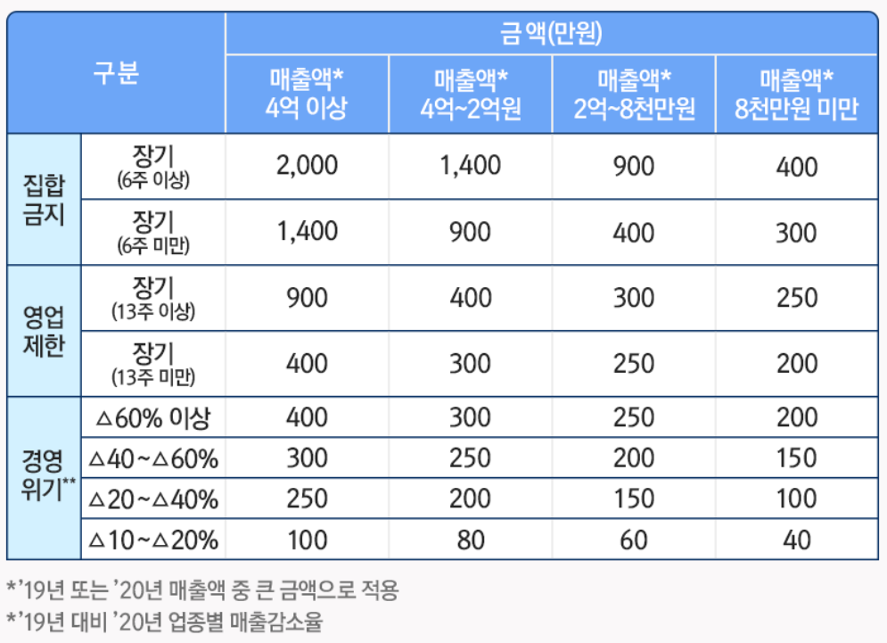 그리고 집합금지 기간에 따라 우선적으로 분류가 된 다음에 다시 연 매출액을 기준으로 4가지 항목으로 구분이 됩니다. 이때 매출액 기준은 19년과 20년 중에서 매출액이 크게 나온 해를 기준으로 합니다. 소상공인들에게는 보다 유리한 조건입니다.