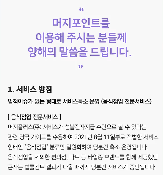 이렇게 엄청나게 팔린 머지포인트가 갑자기 사용처가 급격히 줄어들게 됩니다. 기존에는 위에 언급드린 편의점과 대형마트, 카페, 식당 등 일상생활에 밀접한 사용처들이었는데요.