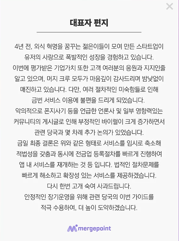 바로 머지포인트가 제대로 신고된 업체가 아니기 때문에 금감원으로부터 제재를 받게 되어서 그렇습니다. 머지포인트는 '전자금융업'으로 사업체가 등록되어야하는데 그렇지 않았기 때문에 머지포인트를 판매하는 것이 불법이 되버린 것입니다.
