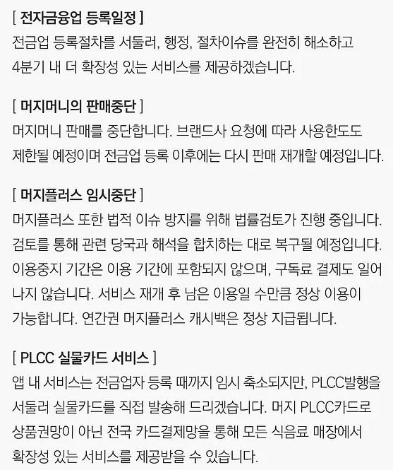 환불액도 90%가 아닌 50% 미만으로 환불해 주고 있다고 합니다. 그리고 4분기 때 전자금융업으로 등록해서 다시 사용처를 늘리겠다고 하는데 사람들은 이 말을 믿을 수가 없는 상황인 거죠.