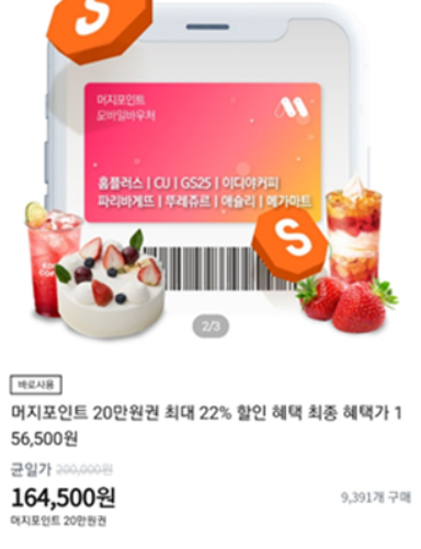 실제 아래 구매 내역을 보면 164,500원에 머지포인트 20만 원권을 판매했던 화면입니다. 사용처는 홈플러스, CU, GS25, 이디야, 파리바게뜨 등 일상생활에서 소비할 수 있는 가맹점들이네요. 어차피 한달에 20만원 쓸 거를 16만 원에 구매한다면 이득이겠죠?