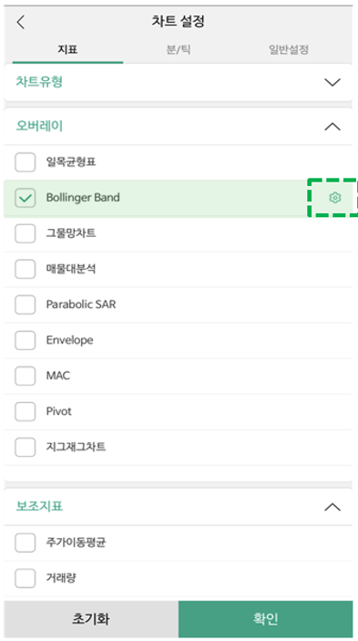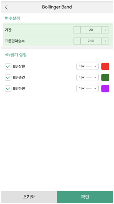 2. 볼린저밴드 설정방법 (나무증권 MTS)