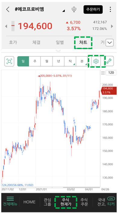 ⓐ MTS>주식현재가>차트 페이지로 들어간다.