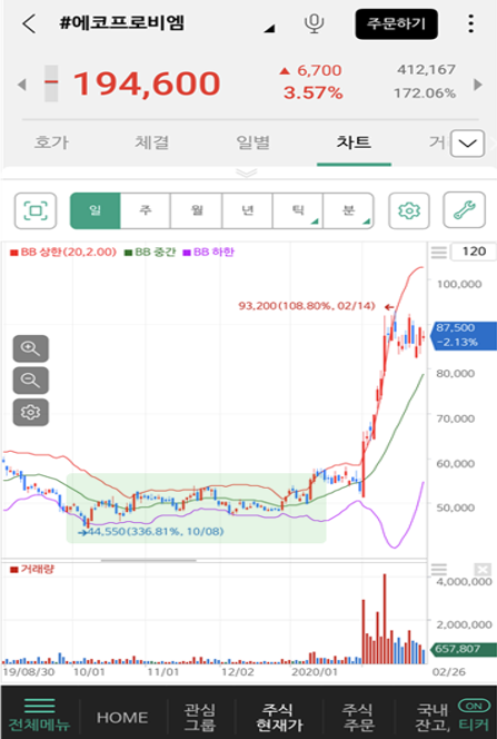 이 구간에서 볼린저밴드 하단(매수), 볼린저밴드 상단(매도)를 하면서 거래를 하는 것을 보통 [스윙]이라고 합니다. 주가는 보통 볼린저밴드 안에서 움직이기 때문입니다. 그러나 2020년 2월쯤 주가가 폭등하기 시작합니다. 우리는 이 차트를 보고 무엇을 배워야 할까요?