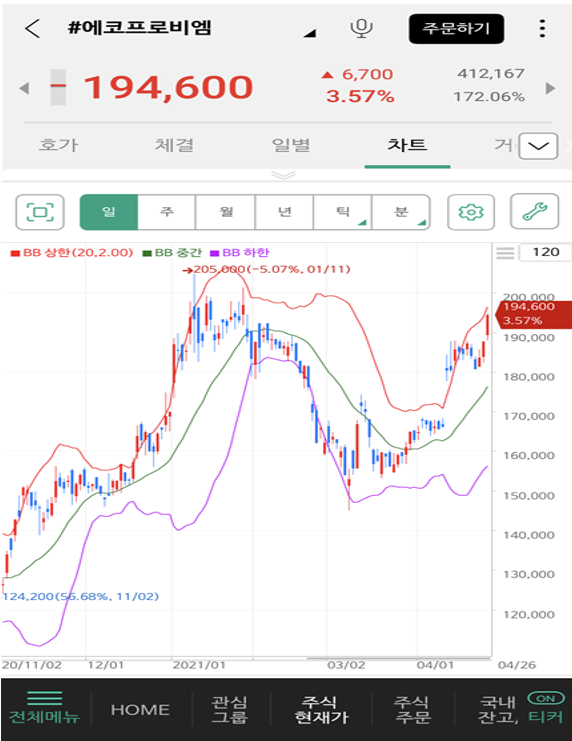 위와 같이 볼린저밴드의 설정을 완료했다면 이 기술적 지표의 활용법에 대해 배워보겠습니다. 볼린저밴드 활용법에 가장 적합한 예시가 [에코프로비엠의 2019년~2020년] 사이의 차트입니다.