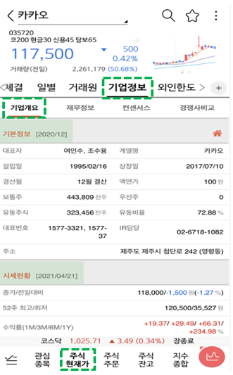 최근 가장 주목받고 있는 기업 중 하나인 카카오를 예를 들어 설명해보겠습니다. <Fig. 1>는 MTS> 주식 현재가> 기업정보> 기업개요본 페이지에서는 기업의 다양한 정보를 찾아볼 수 있습니다.