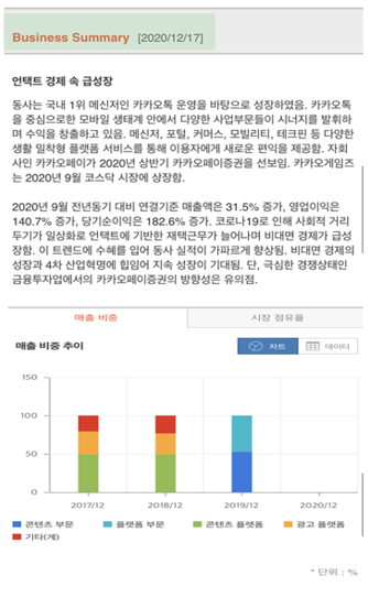 본 항목은 해당 기업이 어떤 사업을 영위하여 수익을 창출하는지를 설명하고 있습니다. 카카오는 언택트 경제 속서도 급성장 기업으로 설명이 되어있습니다.