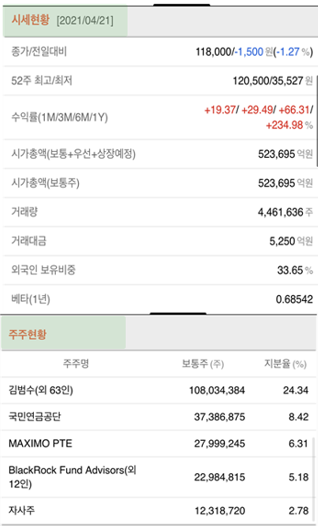 주주현황에서는 해당 주식을 보유하고 있는 대주주의 명단과 지분율을 확인할 수 있습니다. 카카오의 주주현황에는 최대주주인 김범수(외 63인)와 국민연금, MAXIMO PTE 등 을 확인할 수가 있습니다. 최근 사회적 기업으로 발돋움하기 위해 기부를 선언하신 김범수 의장의 이름도 찾아볼 수 있습니다. 김범수 의장을 포함한 63인의 총합 주식이 108,034,384주 (24.34%)로 확인이 가능합니다.
