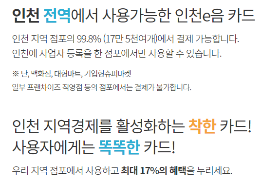 그러나 현재는 코로나 특수 상황이라 어떤 지역구의 이음 카드를 발급받더라도 인천 전 지역에서 동일한 할인 혜택을 받을 수 있습니다. 그러면 지금부터 인천 이음 카드의 발급방법과 사용처, 캐시백 혜택 등에 대해서 알아보겠습니다.