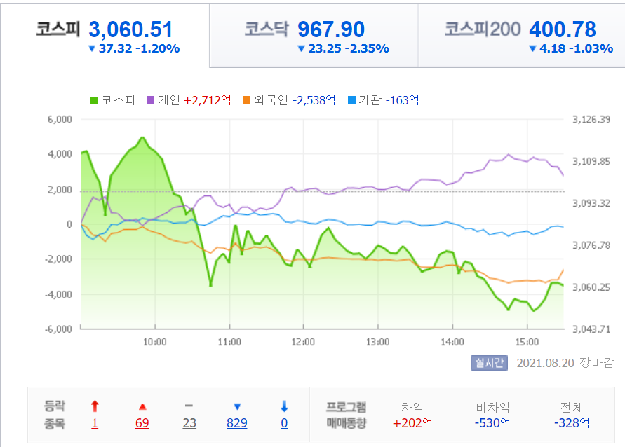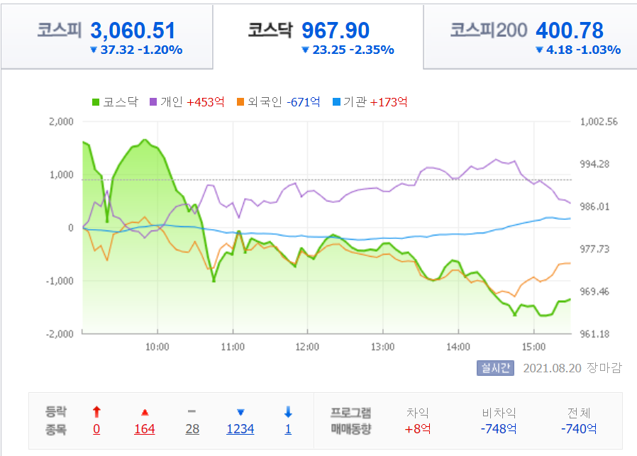 그렇다면 실제 증시가 가장 많이 하락한 8/20(금)의 외국인, 기관의 매매 동향을 보겠습니다. 코스피는 외국인이 2500억, 기관이 160억 정도 매도했습니다. 고작 이 정도 팔고 증시를 1.2%나 하락시켰습니다.