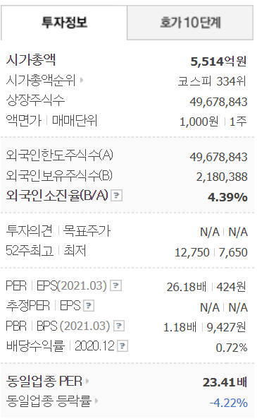 남해화학은 영업이익이 260억 수준인 반면에 시가총액이 5500억으로 저평가된 기업은 아닙니다. 다만 매출이 1조가 넘는 회사이기 때문에 영업이익이 조금 적어도 멀티플 20배 정도는 유지하고 있습니다.