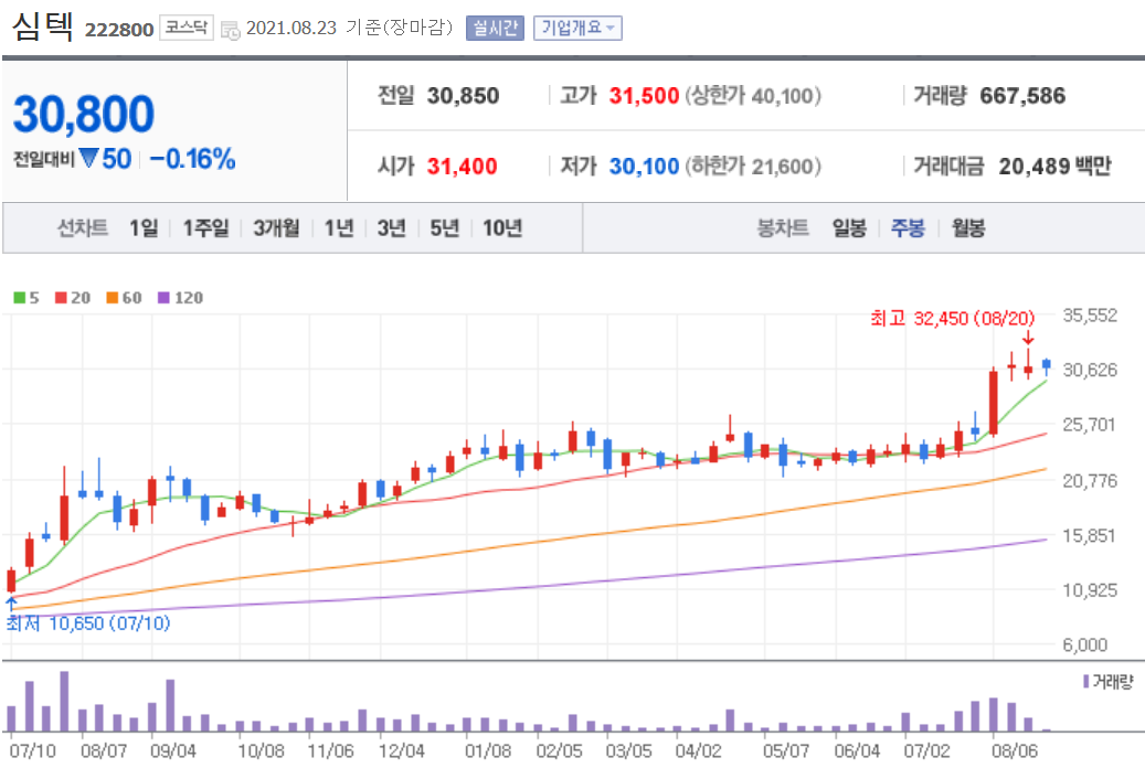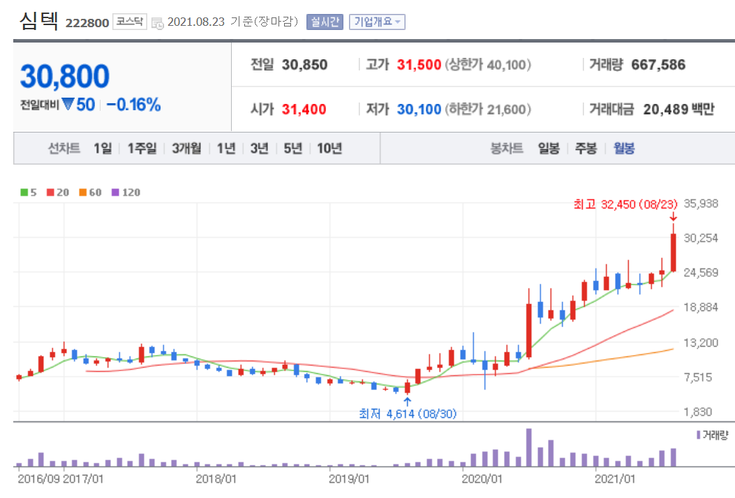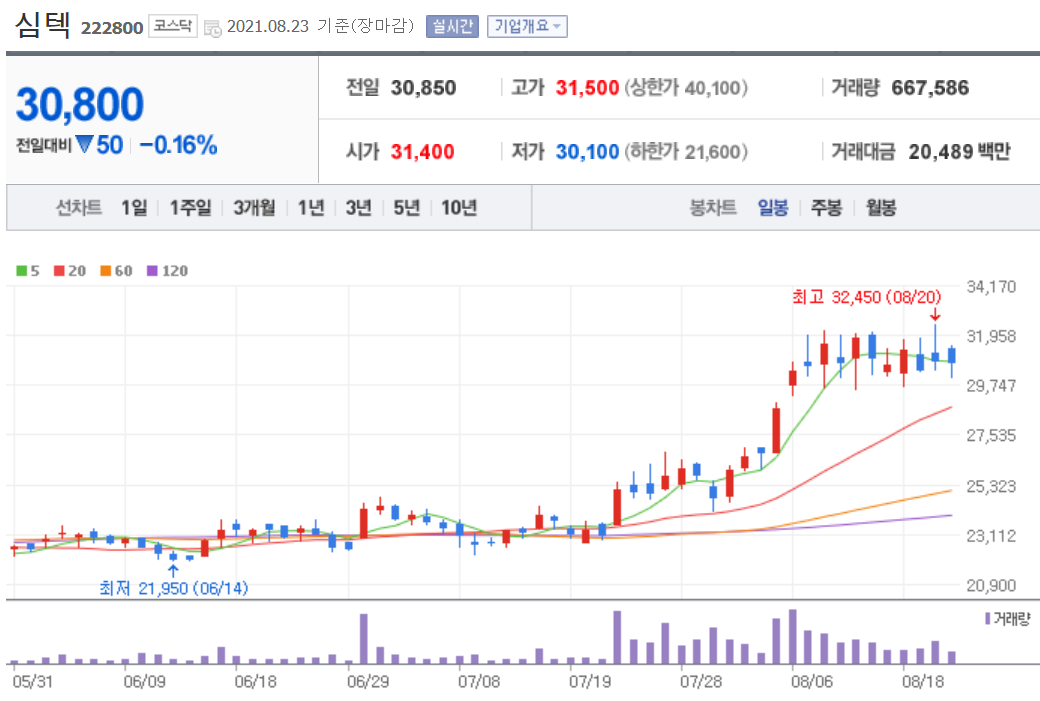 오늘은 심텍 주가 전망에 대해서 알아보았습니다. 심텍이 7월에 2만 원대 초반에서 계속 안 간다고 생각했는데 어느덧 50% 가까이 급등을 했습니다. 지금은 조정이 나와도 이상하지 않을 타이밍입니다. 그리고 지난주의 폭락장에서도 심텍은 잘 버텼습니다. 심텍은 실적을 잘 추적하셔서 투자해야 할 종목이니 계속해서 관심을 가지고 보셔야 합니다.