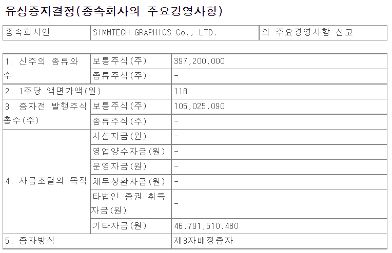 심텍에서 공시한 유상증자는 일본의 심텍 자회사인 SIMMTECH GRAPHICS에 자본잠식 해소 및 재무구조 개선을 위해서 발행되었습니다.