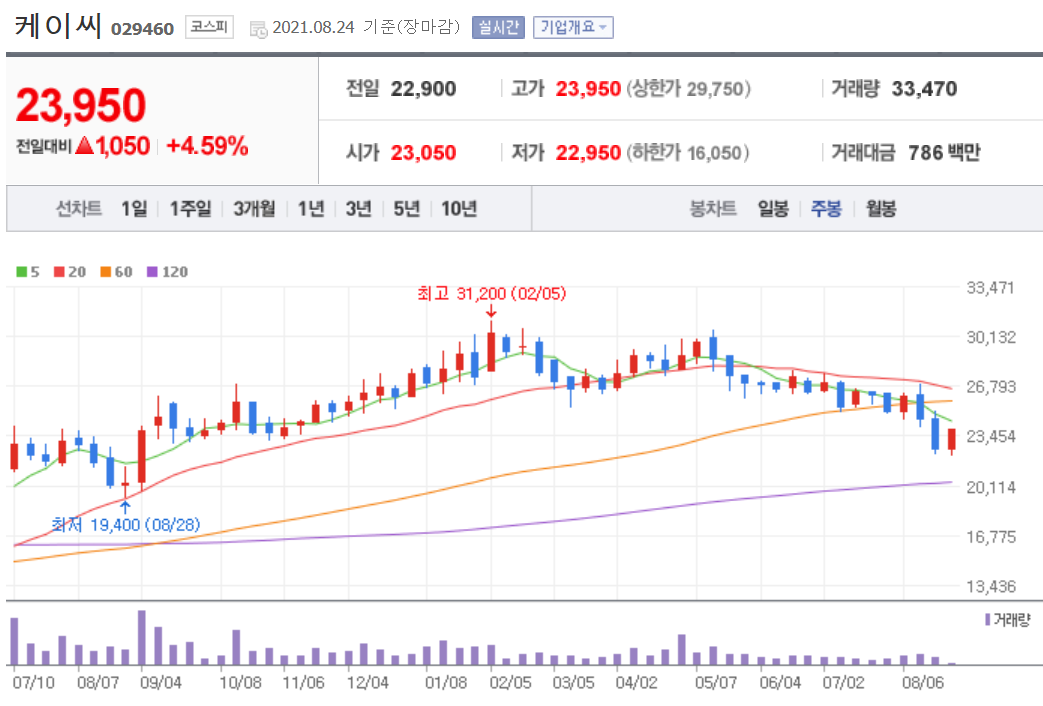 그런데 케이씨의 주가 흐름은 굉장히 무거운 편인데요. 일봉상으로 최근 우리 증시가 급락하면서 차트가 많이 망가진 모습니다. 주봉상으로도 120선까지 깊게 빠져있는 상태이고요.