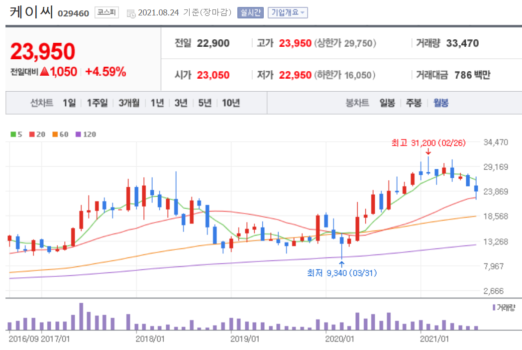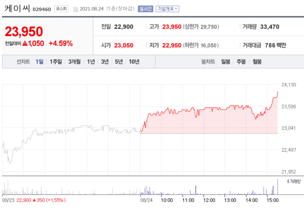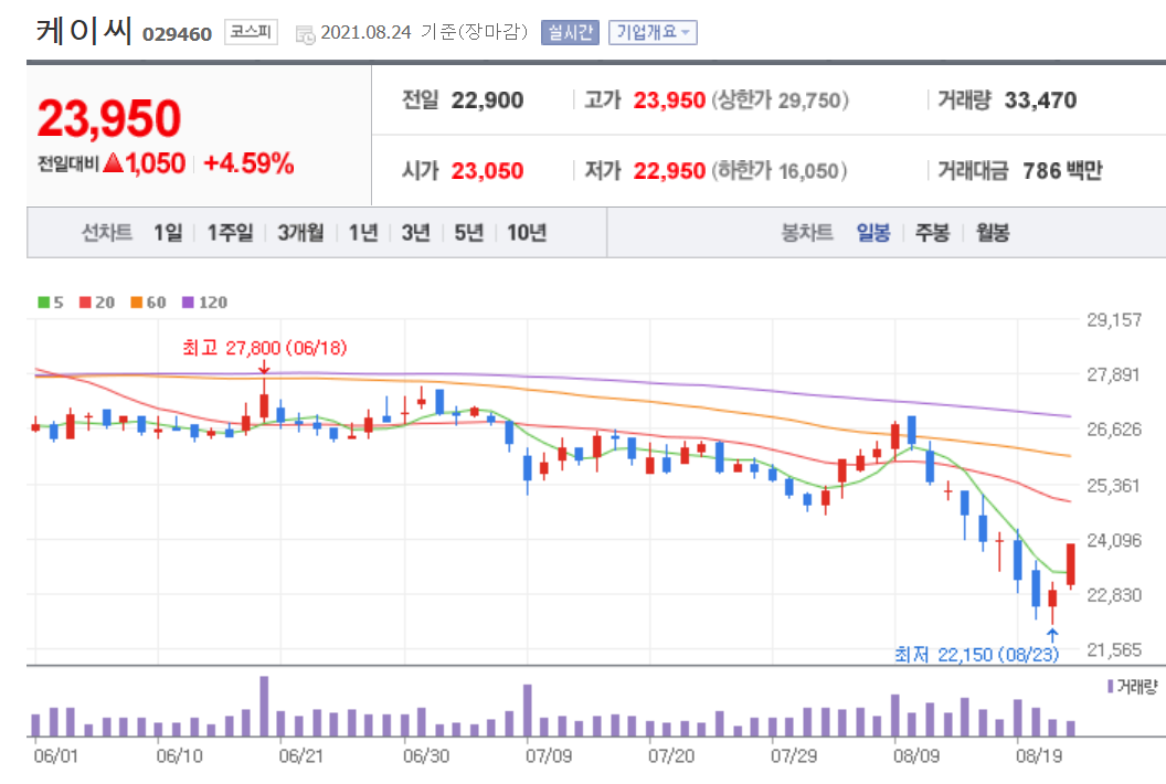 오늘 발표된 삼성전자의 반도체 240조 원 투자에 케이씨의 주가가 어떻게 변할지 지켜보시는 것도 재밌을 것 같습니다. 미리 케이씨를 매수하신 분들은 홀딩하시면 되고 새롭게 입성하실 분들은 내일 급등하더라도 굳이 따라 들어가실 필요는 없습니다.