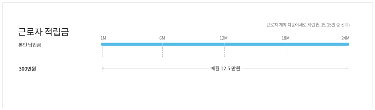 청년 내일 채움 공제에 가입한 근로자는 매달 12만 5천 원씩 2년간 납입만 하면 됩니다. 2년간 근로자가 내는 총금액은 300만 원입니다.