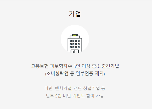 - 해당 기업 : 고용보험 가입 피보험자수가 5인 이상인 중소/중견기업 (3년 평균 연매출 3천억 미만, 소비향락업 등 일부 제외. 단, 벤처기업, 청년 창업기업 등 일부 1인 이상 ~ 5인 미만 기업도 참여가 가능)