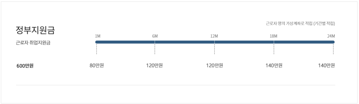 그리고 정부는 기간별로 지원금의 차이가 있는데요. 첫 달은 80만 원이고 6개월, 12개월 시점에서 각 120만 원씩 그리고 18개월과 24개월 시점에 140만 원씩 총 600만 원씩 적립이 됩니다.