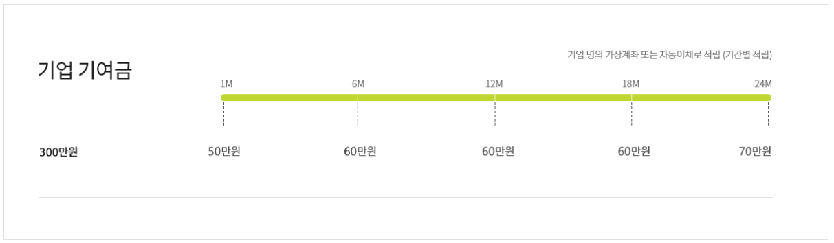 기업 기여금은 첫달 50만원을 시작으로 6개월, 12개월, 18개월 시점에 각각 60만원씩 적립되고 마지막 24개월 시점에서는 70만원이 적립되어 총 300만원의 기업기여금이 생기게 됩니다. 기업기여금은 기업에서 내는 것이 아니라 정부에서 기업에 지원해주는 금액입니다.