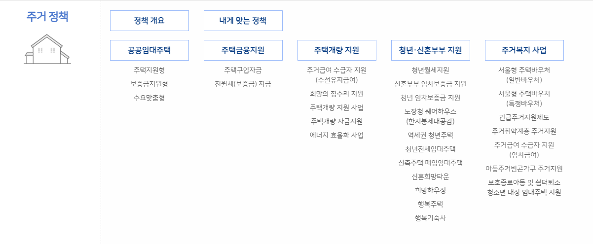서울 주거 포털에서는 다양한 주거 정책 지원을 제공하고 있습니다. 서울 주거 포털에 접속하시면 아래와 같이 다양한 주거 정책을 확인해 볼 수 있습니다.
