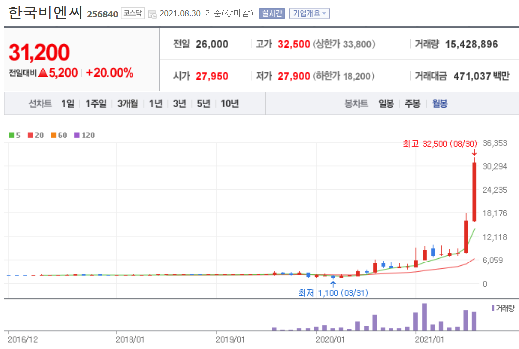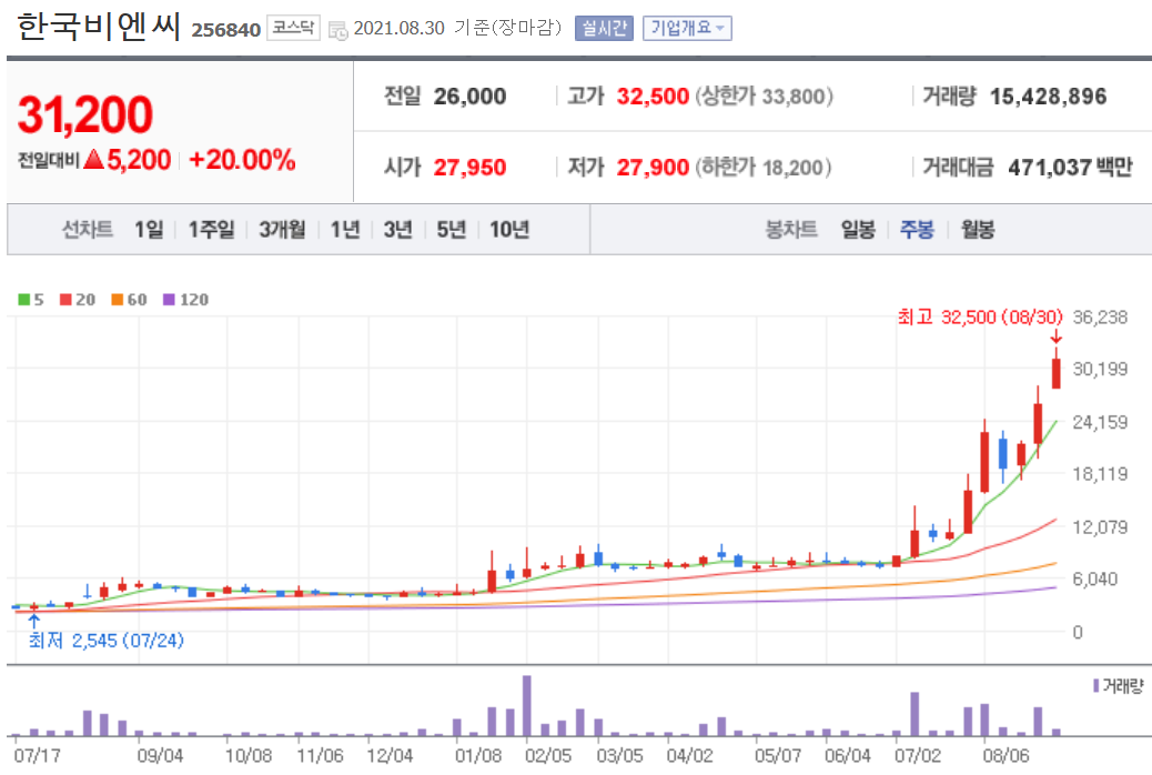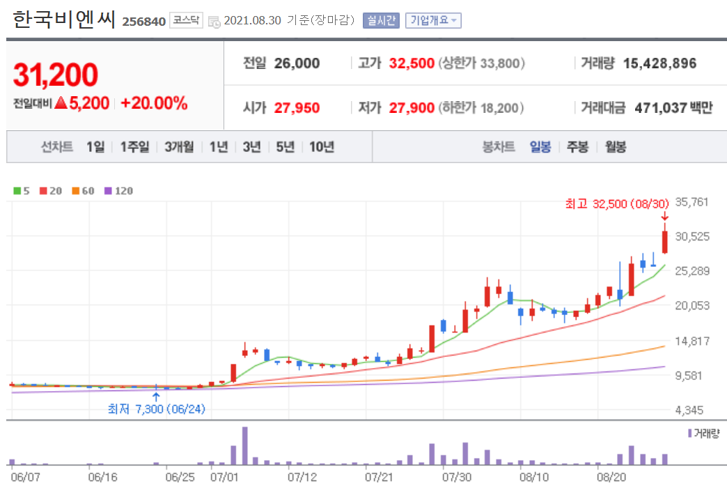 위와 같이 안트로퀴노놀의 기대감이 반영되면서 한국비엔씨의 주가가 엄청나게 급등하였습니다. 2달 만에 4배 이상 상승하는 저력을 보여주고 있습니다.