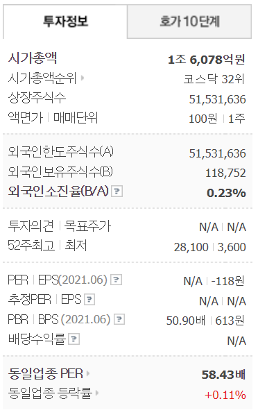 올해 상반기 영업이익은 -69억 원으로 적자입니다. 하반기 때 아무리 좋아진다고 해도 올해 영업이익은 적자를 면치 못할 것입니다. 안트로퀴노놀의 기대감만으로 시총이 1조 6천억 원이 되었습니다.
